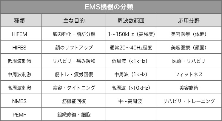 近年、Electromagnetic Muscle Stimulation(電磁気筋刺激、EMS)つまり、電磁場を利用して筋肉を強制的に収縮させる技術が、医療や美容、リハビリテーション、スポーツパフォーマンス分野で使われています。EMSの一言でくくることも多いと思いますが、実際には以下の7種類に分けて説明すると理解しやすいでしょう。